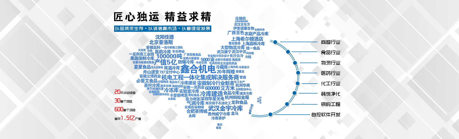 冷凍冷藏設(shè)備大型冷庫項(xiàng)目: 武漢中百物流冷庫(40000㎡)、蘇州、北京普洛斯大型物流庫(17000㎡)、沈陽佳德物流冷庫(20000㎡)、上海東航配餐物流庫(6000㎡)、杭州華商勾莊物流冷庫(24000㎡)、安徽安心蔬菜綠色食品冷庫(12000㎡)、武漢金宇冷庫(35000㎡)、必斐艾食品廠(14000㎡)、中國-東盟(百色)農(nóng)產(chǎn)品交易中心冷庫物流工程(30000㎡)、遵鐵物流冷鏈物流區(qū)建設(shè)項(xiàng)目中心冷庫物流工程(16500㎡)、長沙云冷產(chǎn)業(yè)園冷庫物流工程(21000㎡)等;大型中央空調(diào)項(xiàng)目: 武漢康寧顯示玻璃廠廠房、武漢京東方模組廠房、武漢華星光電模組廠房、深圳華星光電模組廠房,杭州阿里巴巴辦公樓,舟山波音737機(jī)場辦公樓,南京江北能源站、上海金融大酒店等